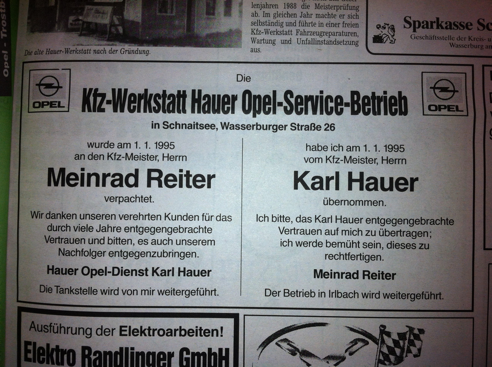 Übernahme der Werkstatt incl. Opel Vertrag von Meinrad und Marianne Reiter